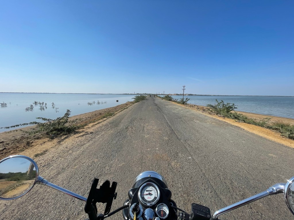 The route was not full of sandy deserts like yesterday but dry terrain with shrubs and no trees. I reached this pace called Narayan Sarovar. Its kinda cut out from the mainland in the gulf of Kutch and the way to reach there is by a road which passes right through the backwaters. It was a classic road-through-water view.