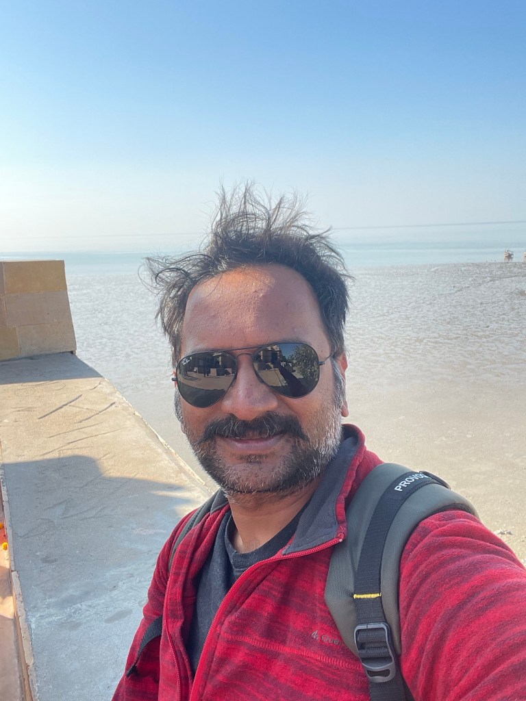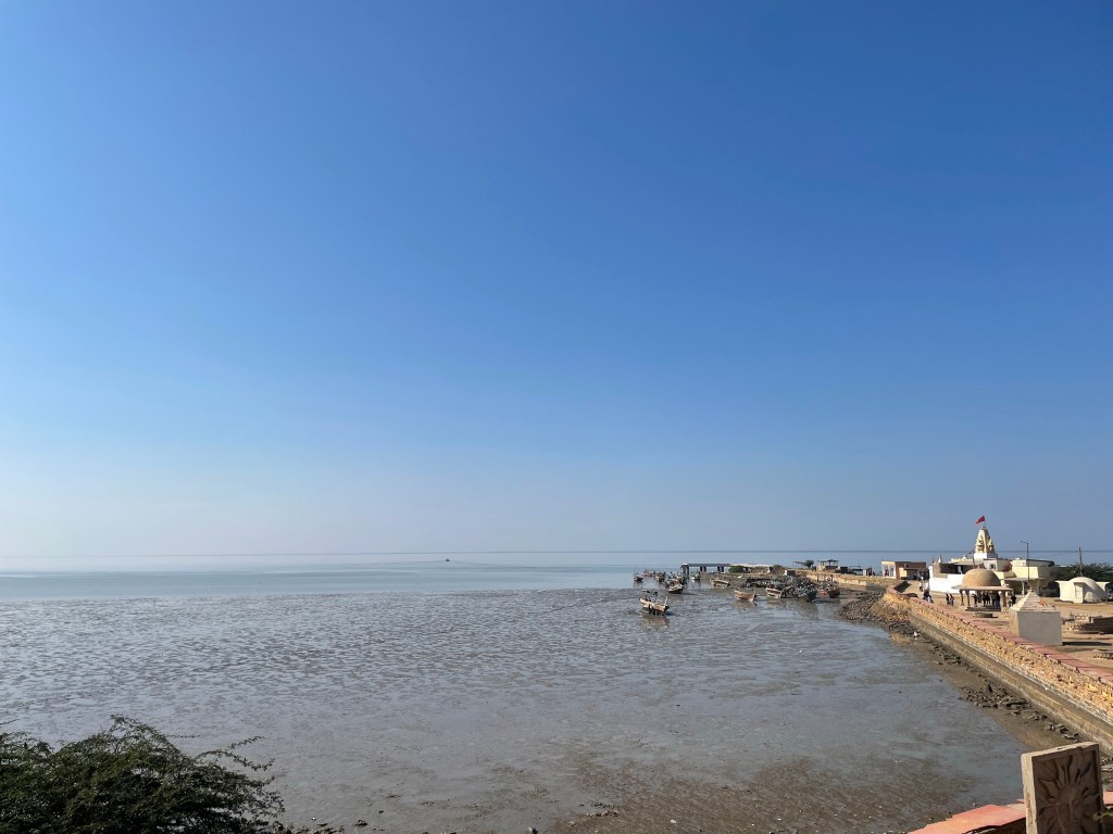 When we take the road further and go another couple of kilometres, we are met with the Sea. Yes. It feels like the desert just ended at the Sea. No trees (expect a couple of ones kept inside the temple). The land is still dry but it suddenly leads to the sea. Even the marshland at the starting of the sea has no major vegetation. It was a very strange sight for me.