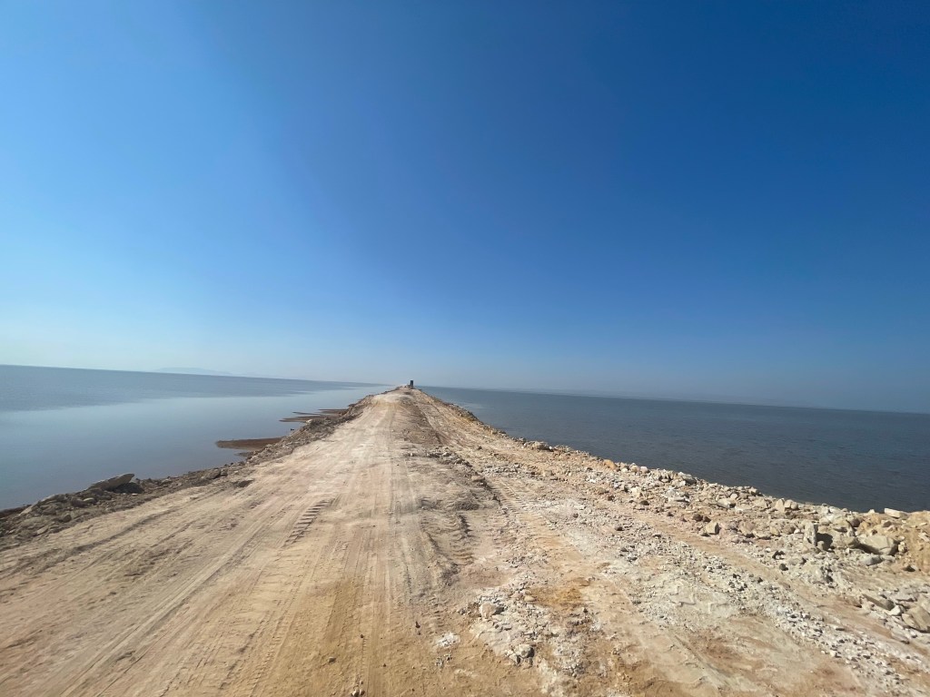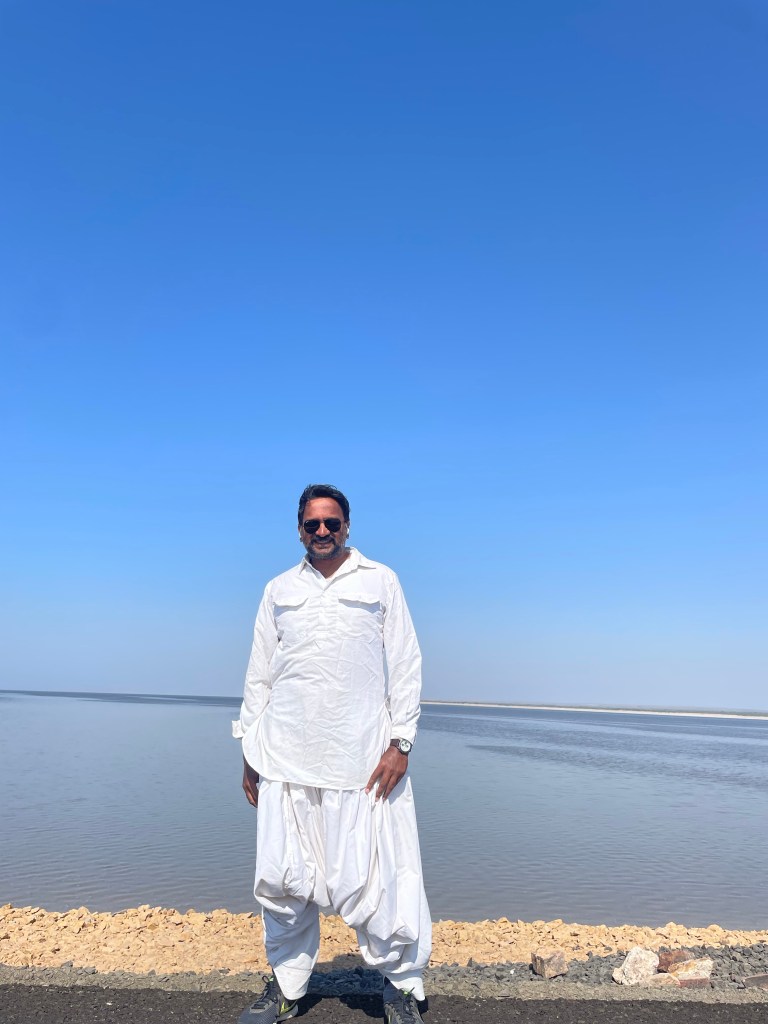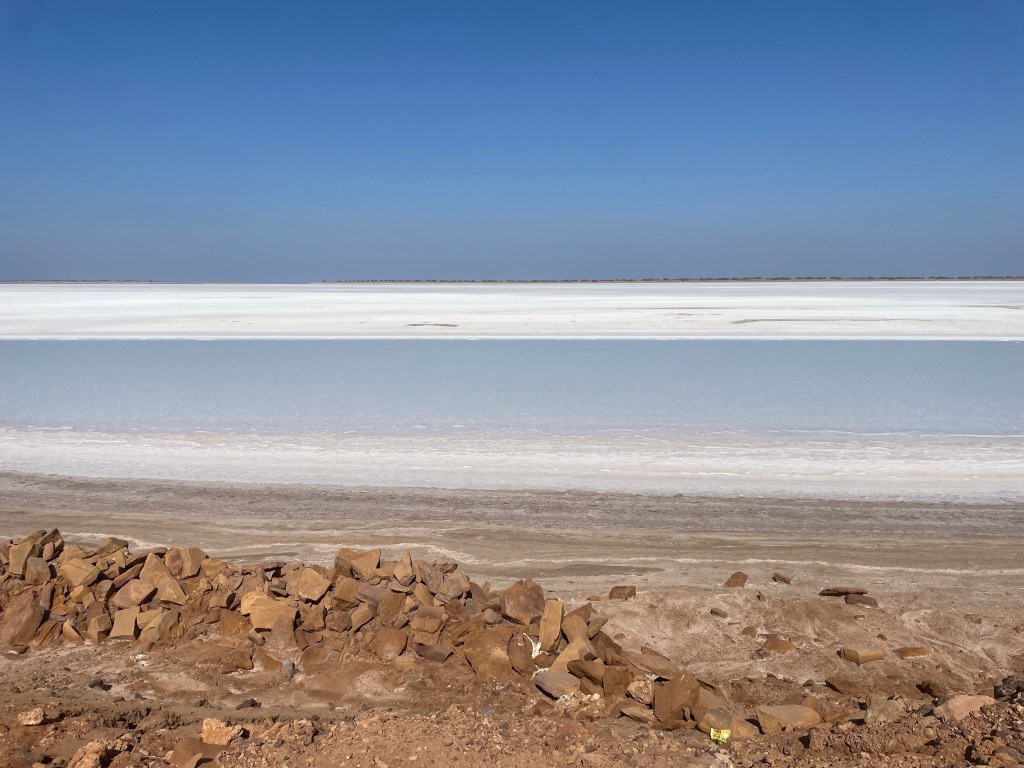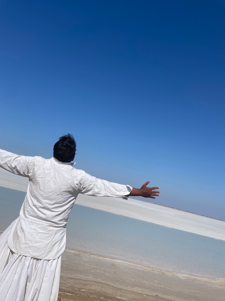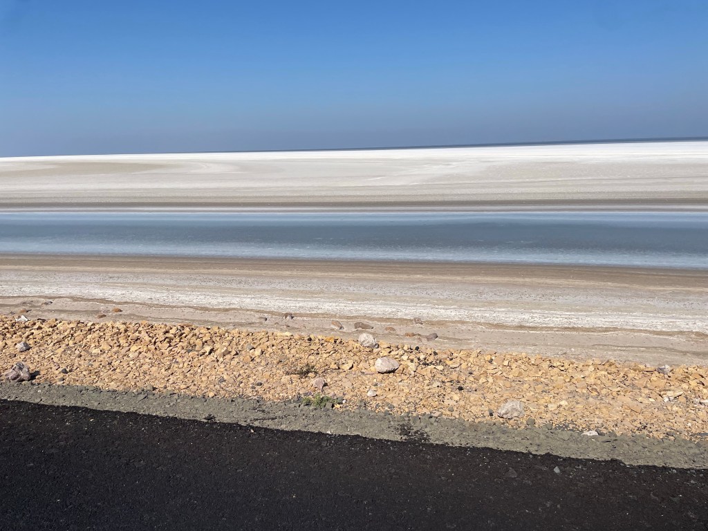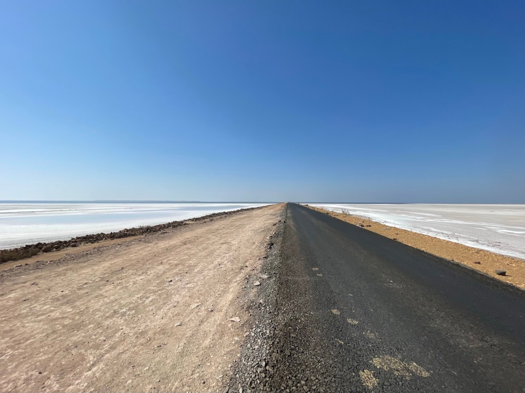 There is white desert on both sides of the road. The road is still being constructed. One side is almost done and the other side is yet to be done. It’s a 30km long stretch and it’s beautiful.