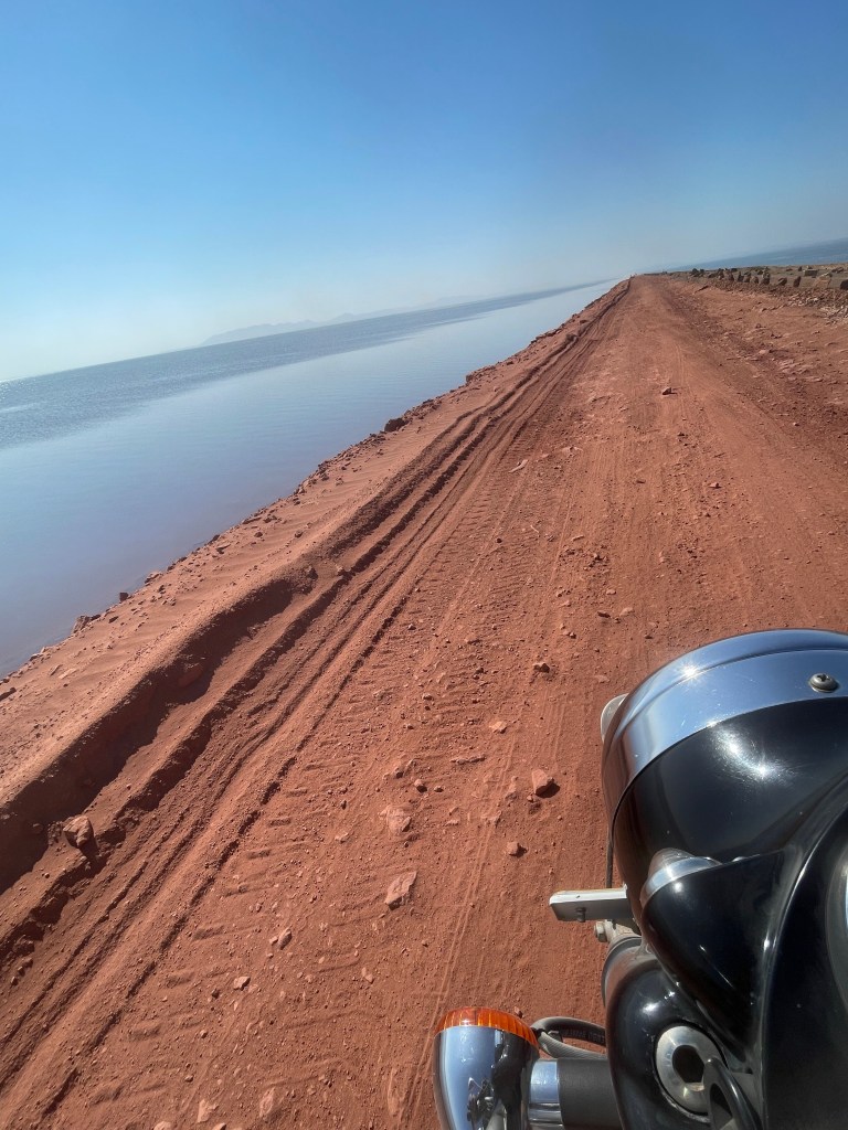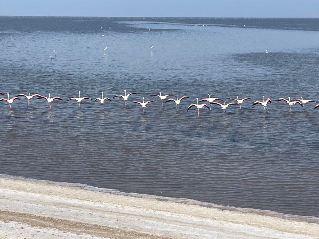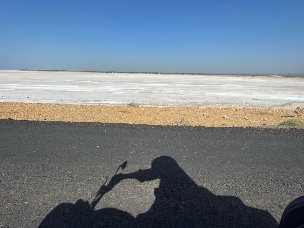 Since the lake has not dried up fully a part of the route has water on both sides and there are hundreds of Flamingos right near the road. The Flamingos walk in a single line along the coast with their long beaks scouting the water for food. However they somehow detect human activity on the road (even if you try walking slowly with the bike parked away) and run inside the water immediately. My phone could not capture great close up shots. But for a bird lover this place is heaven.