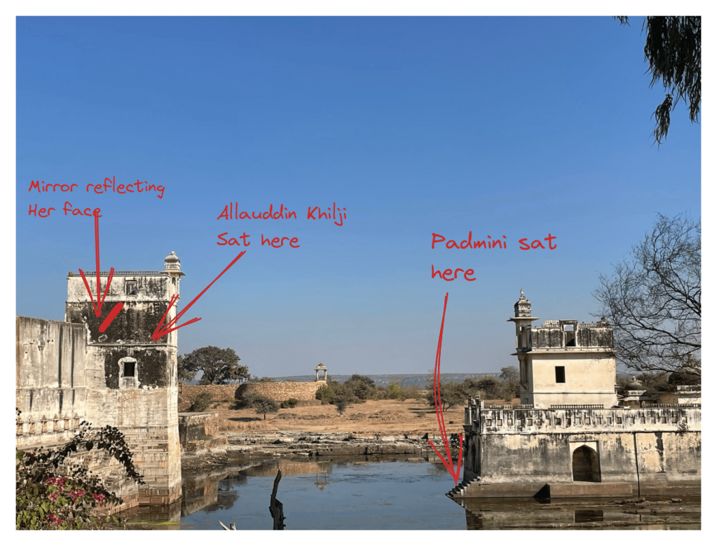 1. Allauddin Khilji indeed magically saw the face inspite of all this complex far distance reflection. If it was true, he need not have waged war at all as what he saw was the saheli and it would have been easy to posses her compared to the Rani.