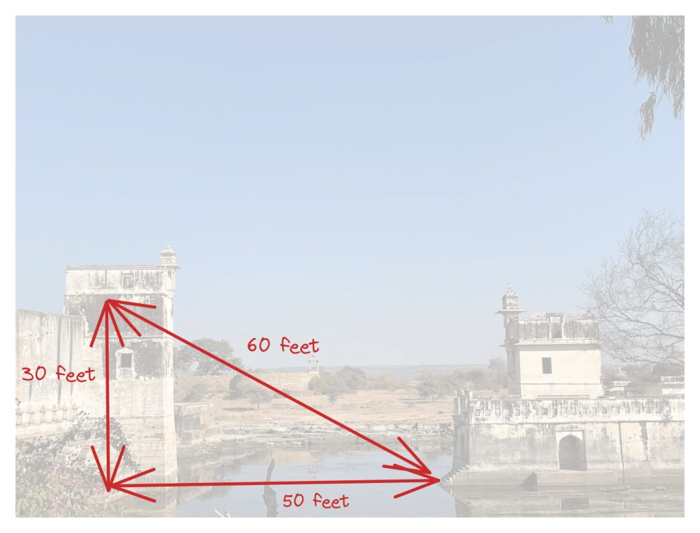 Now let’s dissect this scene a bit. The room he was sitting was on the 3rd floor. This meant it was about 30 feet from the ground. The water palace’s steps were around 50 feet away from the main palace. This means the diagonal distance is about 60 feet.