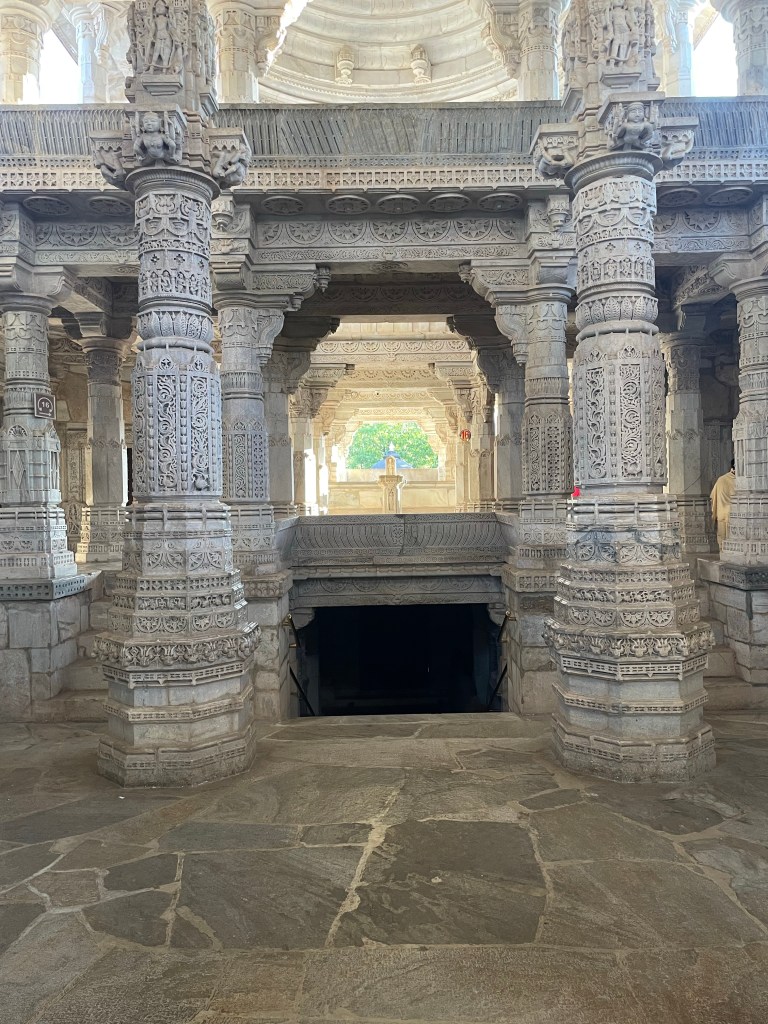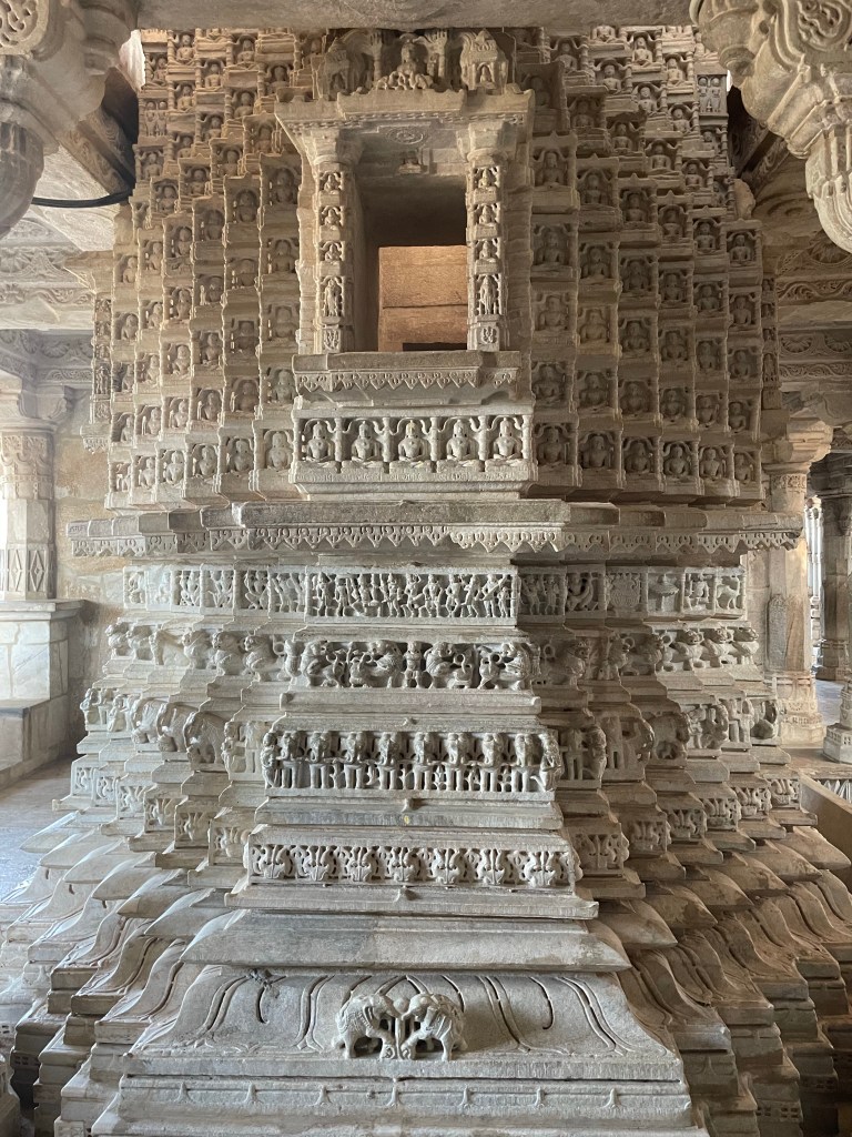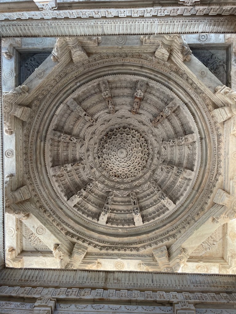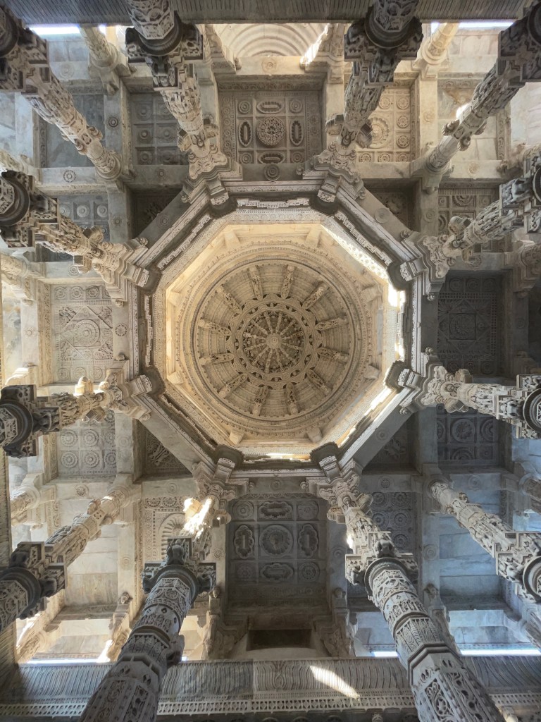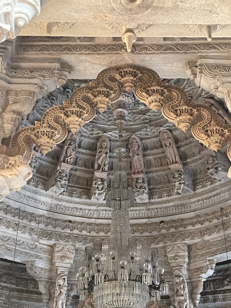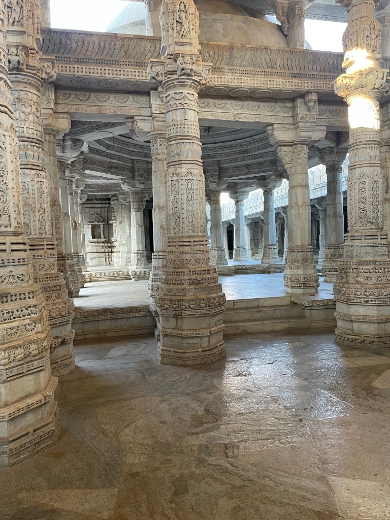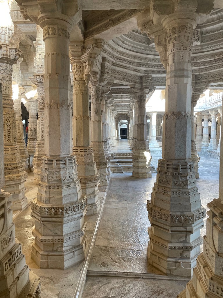 The temple was built in the 15th century and it took 50 years to build. It is built with the concept of four. It’s called Chaturmukha Dharana Vihara. It has four entrances. Each have four main central areas. The four entrances are in alignment with the four directions (NEWS). It’s all made of white marble with exquisite and intricate carvings.