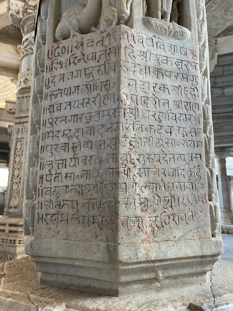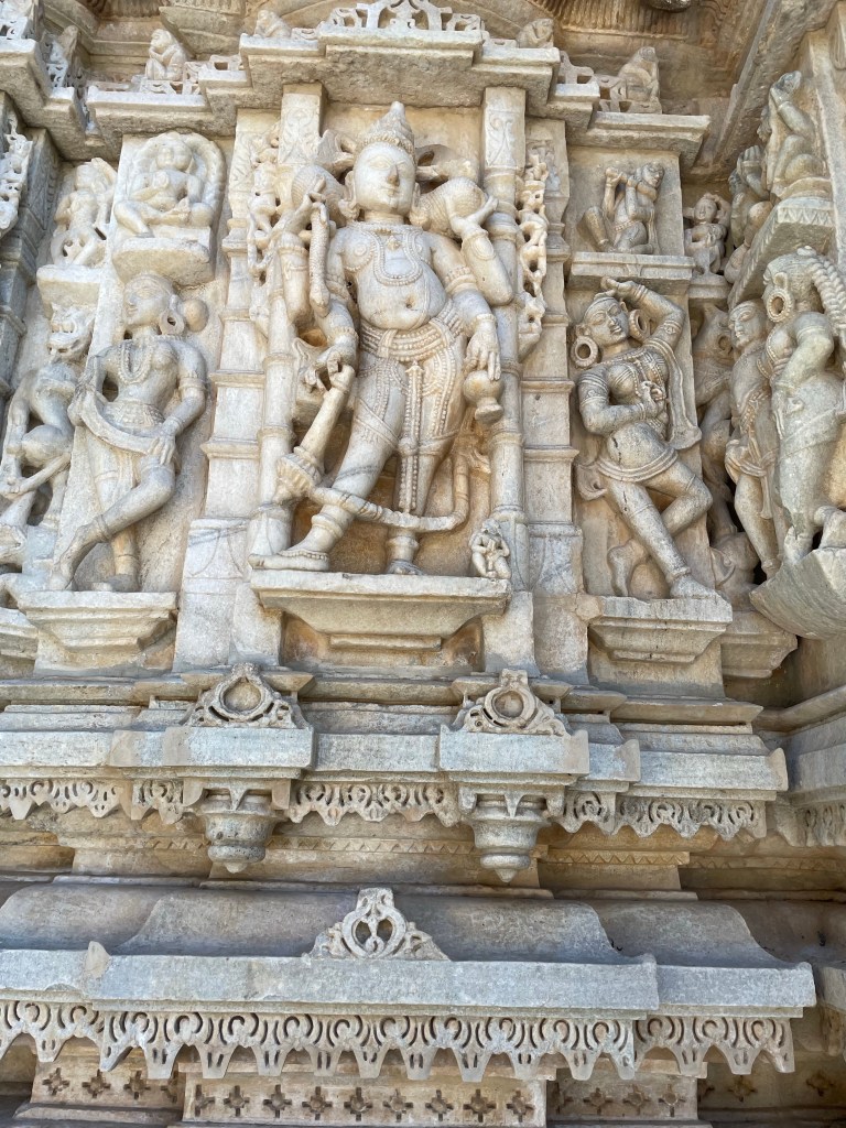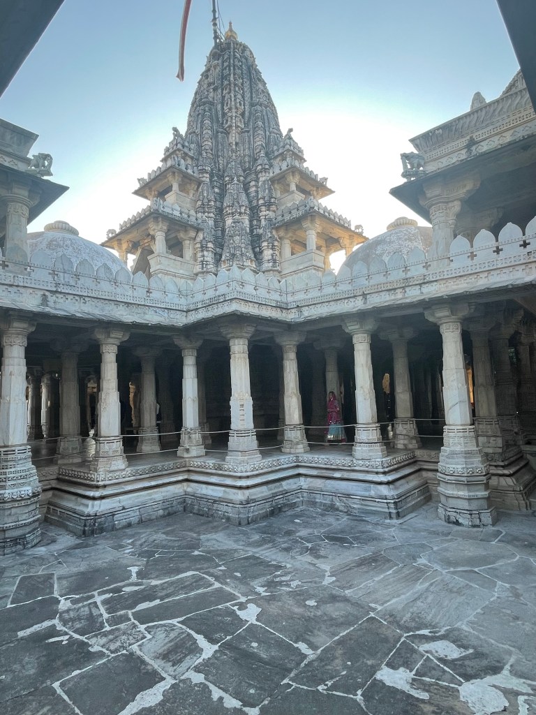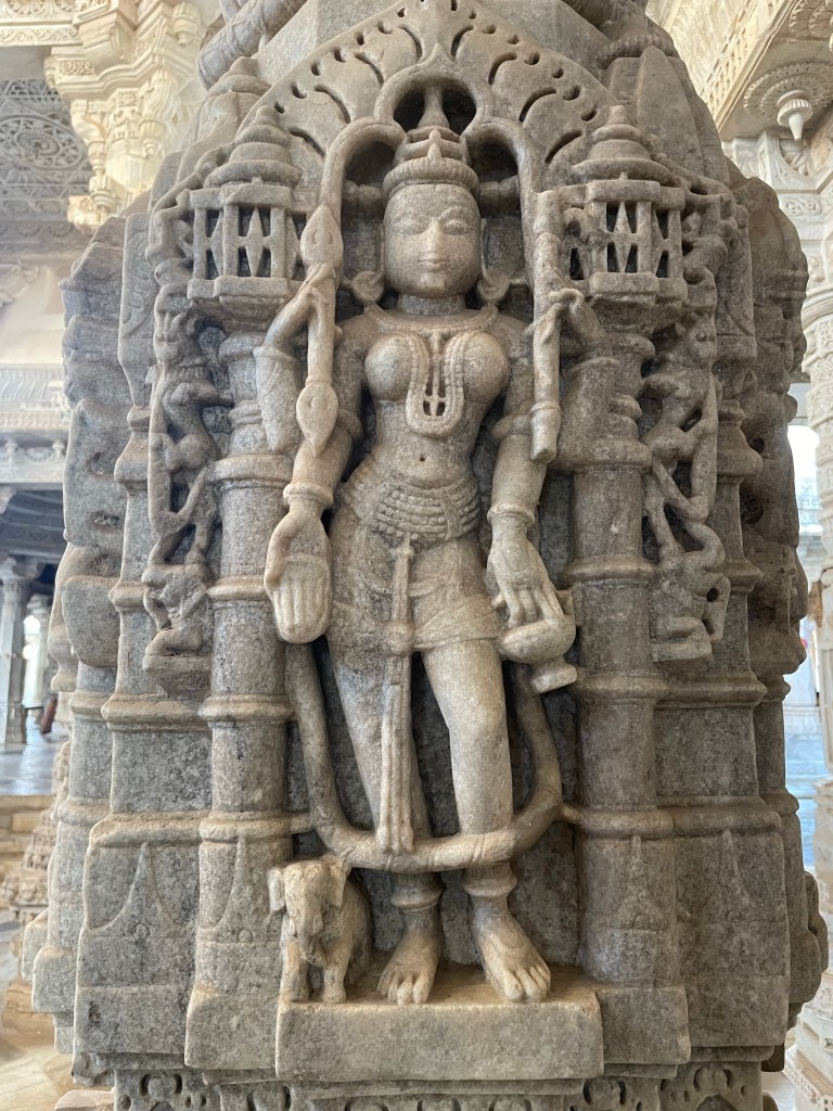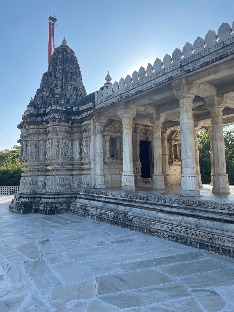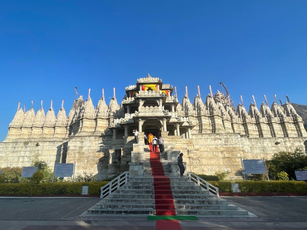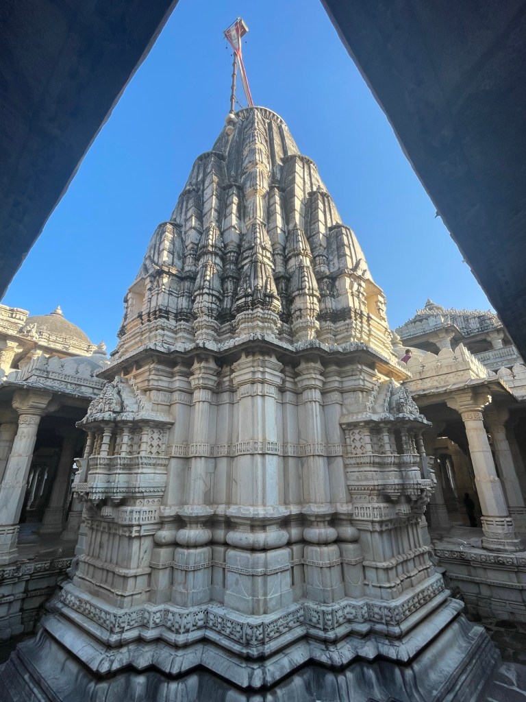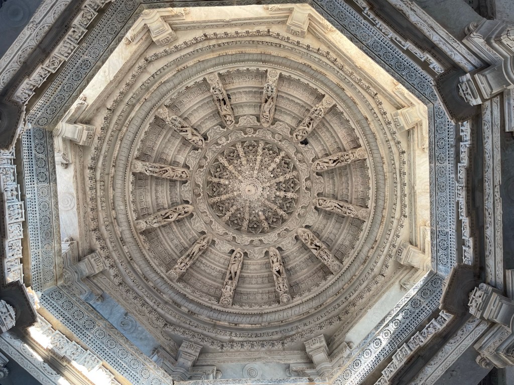The temple was built in the 15th century and it took 50 years to build. It is built with the concept of four. It’s called Chaturmukha Dharana Vihara. It has four entrances. Each have four main central areas. The four entrances are in alignment with the four directions (NEWS). It’s all made of white marble with exquisite and intricate carvings.