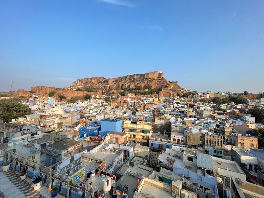 There is a place called Castle View. It is a hotel and has a cafe attached. The view is the entire place from there is stunning. You can have a panoramic view of the Mehrangarh fort and the old city.