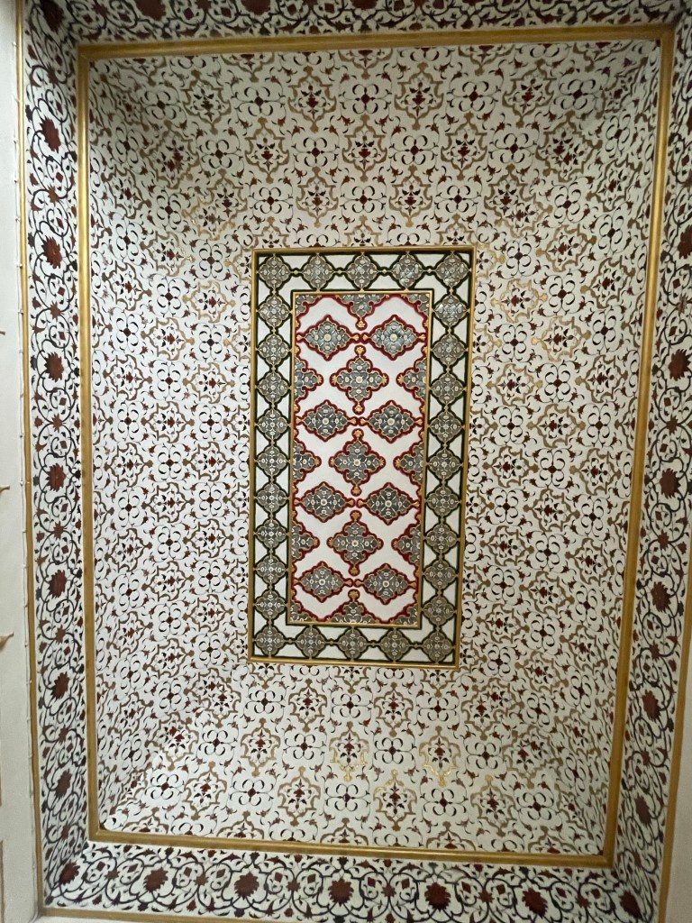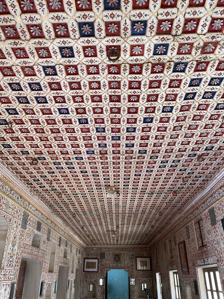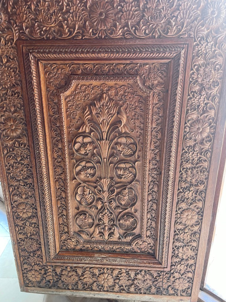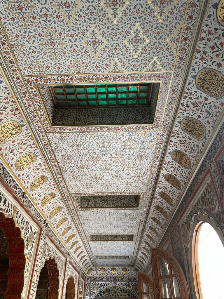 The painting also had an inlay pattern to them. This meant the gold silver and precious stones were inlayed in the tile. It is a typical style in most Mughal forts. So there is a huge influence here. The carvings on the wood also show deep Mughal influence with flowers and plants carved on them.