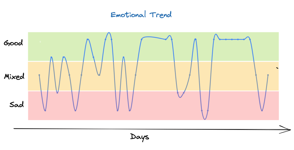 The interesting finding was my feelings were fluctuating. It was not like initially it was all Bad and over the course of the trip it became Good. There were Good and Bad and Mixed days and they fluctuated. Here is a graph of my daily emotional index.