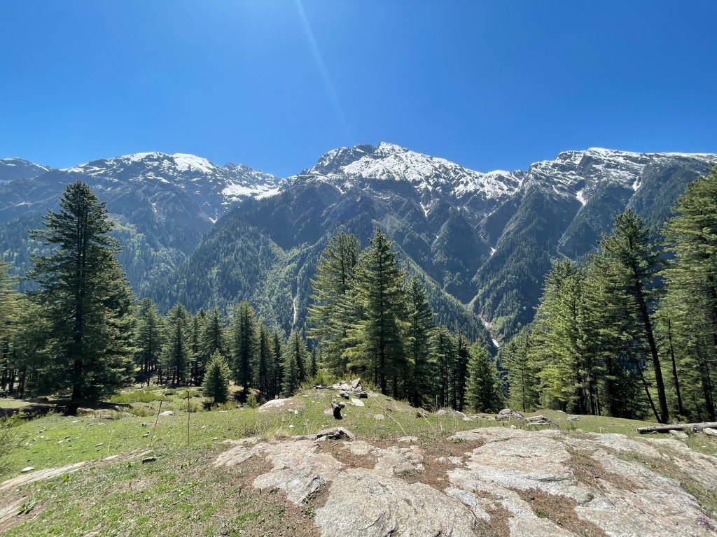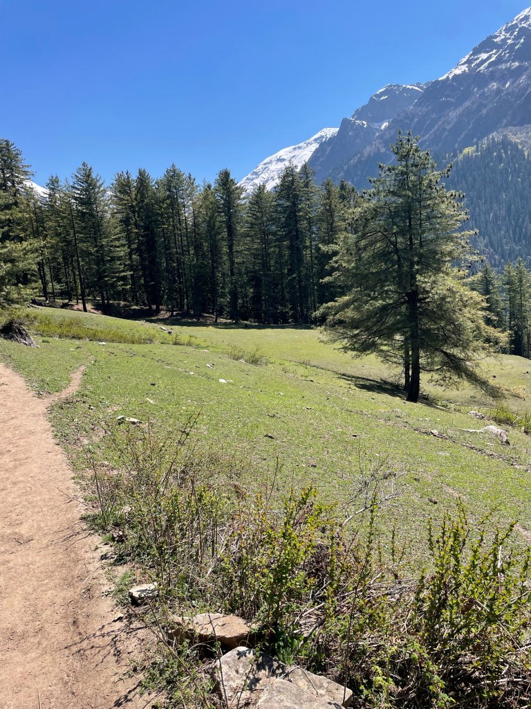 Throughout the trek, we were walking on one side of the Pabbar river. On the other side of the river was a mountain that was covered with snow. This is because the mountain is on the shadow region of the sun and does not get enough heat to melt the snow.