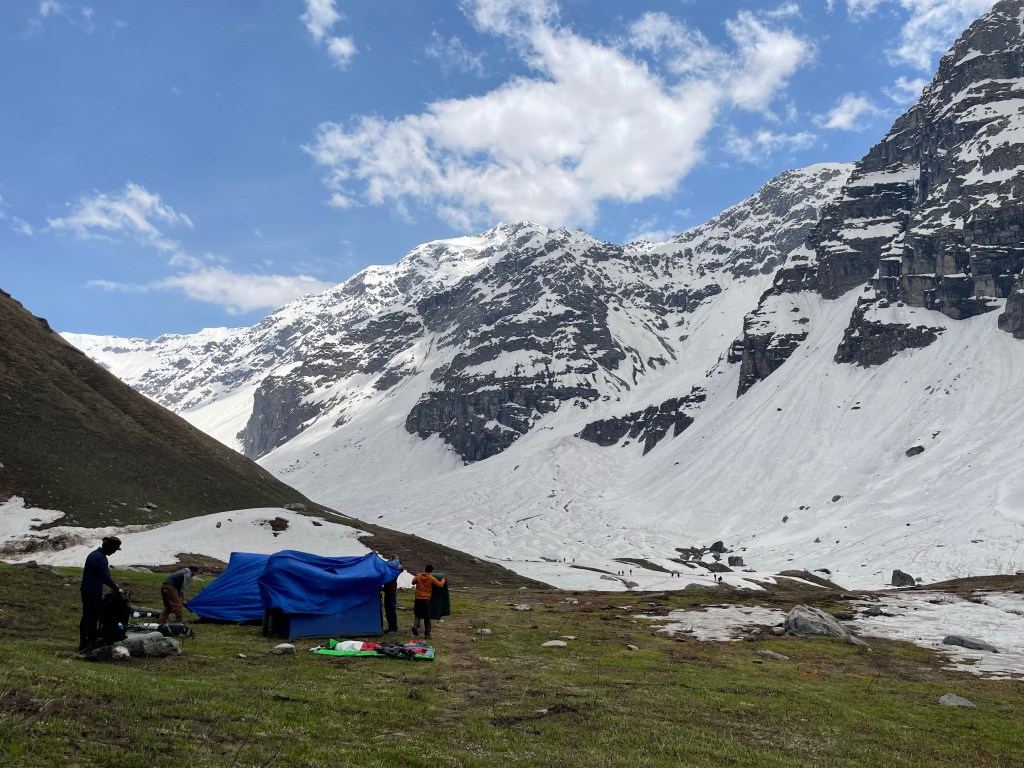 We finally reached our base camp after the tiring but memorable trek. Our shoes were filled with water as the snow that entered the shoes had melted into water. 😃