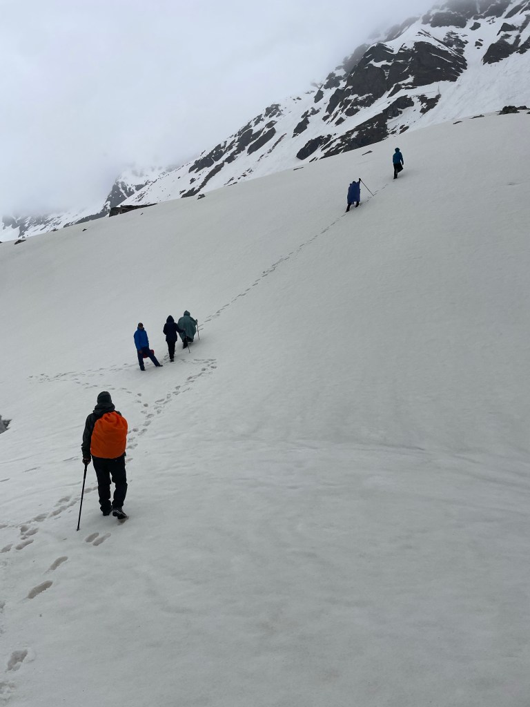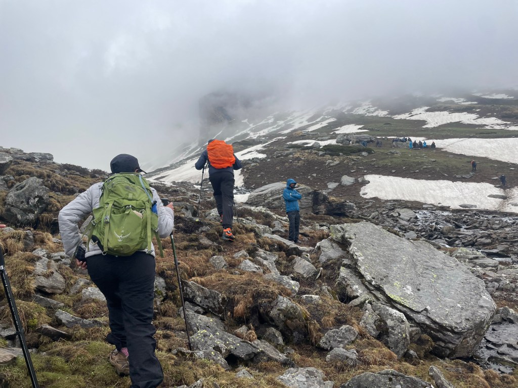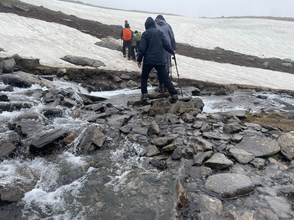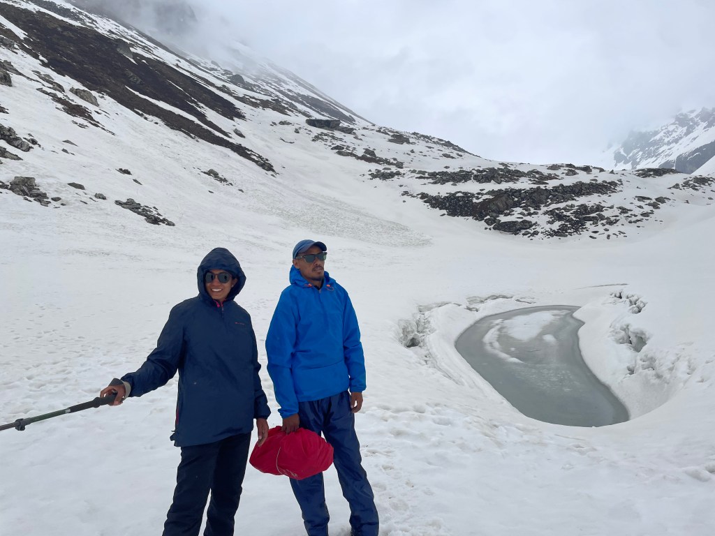 The next day was a steep trek to a place called “Chandranahan lake”. It was a glacial lake and it is the starting point of the Pabbar river. It had rained the whole night and had just stopped a bit in the morning. But it didn’t stop us. We wore our raincoats and started trekking.