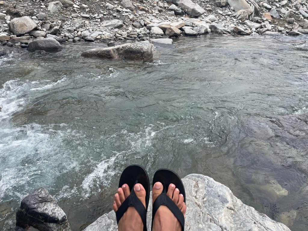 Before starting the trek, I sat on a rock and did my pranayama practice. With the sun shining on me, with the sound of the river creating the soothing sound, with tall mountains around me so as to protect me, with fresh air to breathe, the experience was blissful.
