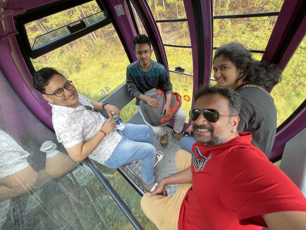 We then took a cable car. I somehow like the idea of travelling by a cable car. It makes you feel like you are a drone flying across the landscape. You are not too high like being on a flight, and you are not too low like standing on a building top. You are high enough to see everything from an arial view and low enough to see the details too. Our cable car ride was through the forests. We were thinking how the trees that came in the way would be cut down, how maintenance is done. As expected, talks and discussions around “what will happen if the cable breaks”, “will we die”, “will be break a limb” etc. did happen.