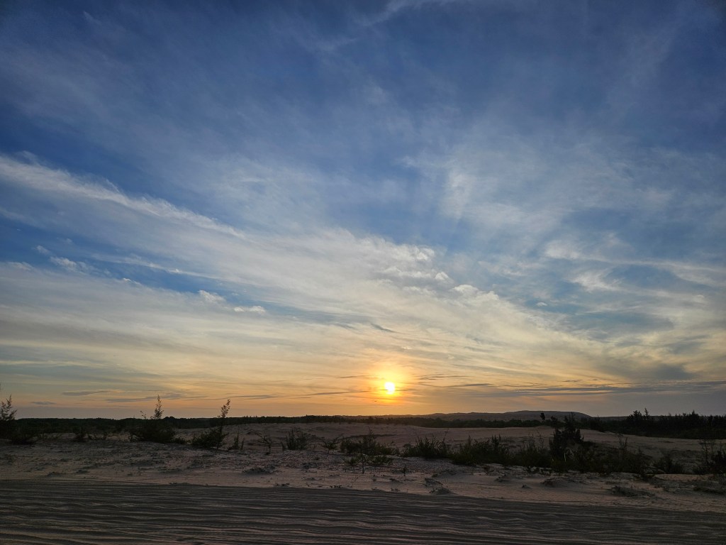 So we walked. 😀 We reached a small dune and sat there to see the Sun’s slow dance. It’s so weird that sunrise and sunset have been happening everyday, for the past god knows how many million years and will probably happen for another million years. There are no surprises/changes/thrillers in the act. It is simple and mundane. The sun just slowly shows up or hides. Thats all. Yet, it’s a pleasure to see it every single time we see it.